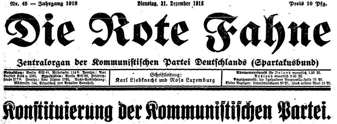 L’insurrection gagne la capitale berlinoise. La révolutionnaire y jette l’ensemble de ses forces, tout en mettant en garde ses partisans : « Un monde doit être bouleversé, mais chaque larme qui aura coulé inutilement est une accusation, et l’homme pressé qui en courant vers sa tâche broie un pauvre vermisseau par pure inattention commet un crime », avertit-elle dans Die Rote Fahne (Le Drapeau rouge), journal de la Ligue spartakiste qu’elle a récemment cofondé avec son ami Karl Liebknecht, seul député à avoir voté contre les crédits de guerre en décembre 1914. Le 15 janvier 1919, ils sont tous les deux assassinés sur ordre de leurs anciens camarades sociaux-démocrates, qui dirigent alors la jeune République de Weimar. Le corps de Rosa Luxemburg est jeté dans un canal de Berlin ; la révolution spartakiste est écrasée.